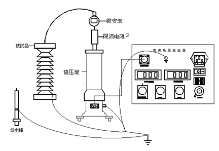 將機(jī)箱、倍壓筒放置到合適位置分別聯(lián)接好電源線、電纜線和接地線,保護(hù)接地線與工作接地線以及放電棒的接地線均應(yīng)單獨(dú)接到試品的地線上(即一點(diǎn)接地),電源開關(guān)放在關(guān)斷位置并檢查調(diào)壓電位器應(yīng)在零位。過電壓保護(hù)整定值一般為試驗(yàn)電壓的1.1倍。順時(shí)針方向平緩調(diào)節(jié)調(diào)壓電位器,輸出端即從零開始升壓,升至所需電壓后,按規(guī)定時(shí)間記錄電流表讀數(shù),并檢查控制箱及高壓輸出線有無異?,F(xiàn)象及聲響。