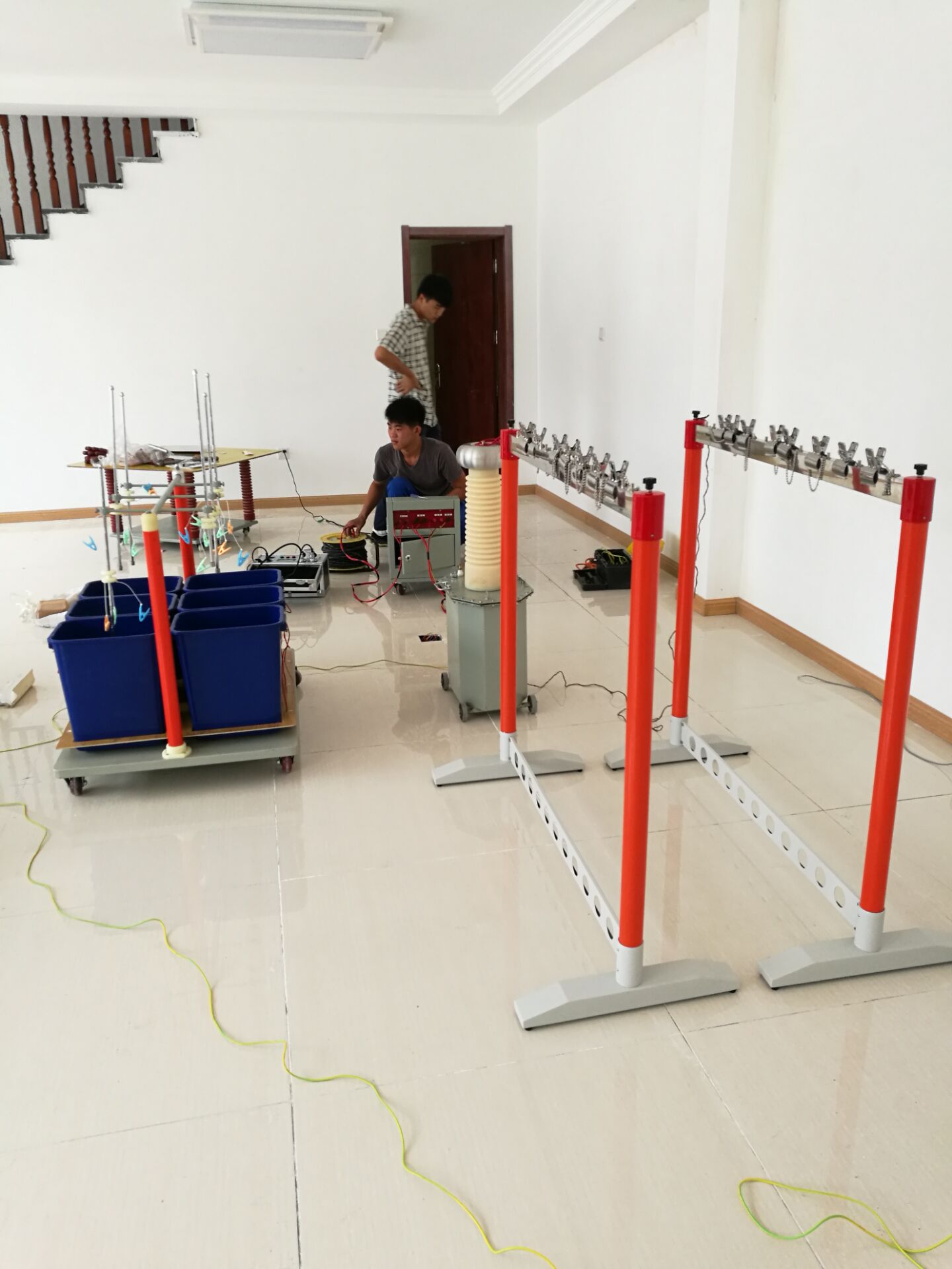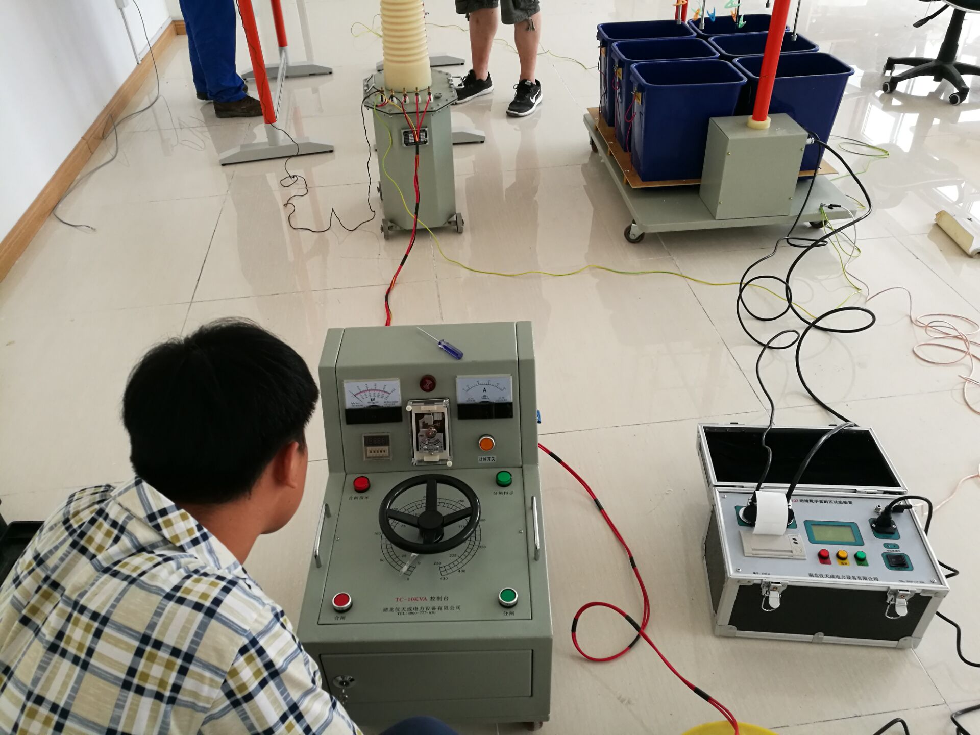 此次培訓的設(shè)備和內(nèi)容很多,其中培訓的主要設(shè)備是YTC1103 絕緣靴(手套)耐壓試驗裝置。李工首先對設(shè)備的原理和功能進行了全面而細致的講解。我公司的該設(shè)備比較先進,測試速度快,提高了工作效率;耐壓、高壓泄漏電流直讀,還可自動識別不合格試品,智能化程度高;可同時測試4雙絕緣靴(手套),并可讀取每只的泄漏電流,準確判斷不合格的絕緣靴(手套);底部裝配腳輪,可隨意移動。非常方便。