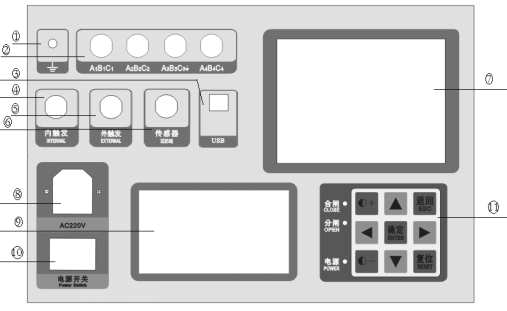 | ⑤ | 外觸發(fā)插座 | 外觸發(fā)方式時(shí),直接并接到分、合線圈兩端,取線圈上電信號(hào)作為同步信號(hào)。 |