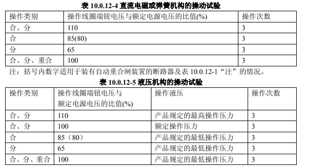 直流電磁或彈簧機(jī)構(gòu)的操動(dòng)試驗(yàn),應(yīng)按表 10.0.12-4 的規(guī)定進(jìn)行;液壓機(jī)構(gòu)的操動(dòng)試驗(yàn),應(yīng)按表 10.0.12-5 的規(guī)定進(jìn)行。