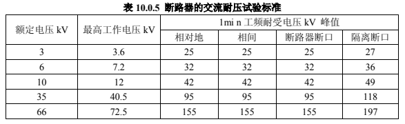 在斷路器合閘及分閘狀態(tài)下進(jìn)行交流耐壓試驗(yàn)時(shí):當(dāng)在合閘狀態(tài)下進(jìn)行時(shí),試驗(yàn)電壓應(yīng)符合表 10.0.5 的規(guī)定。當(dāng)在分閘狀態(tài)下進(jìn)行時(shí),真空滅弧室斷口間的試驗(yàn)電壓應(yīng)按產(chǎn)品技術(shù)條件的規(guī)定,試驗(yàn)中不應(yīng)發(fā)生貫穿性放電。