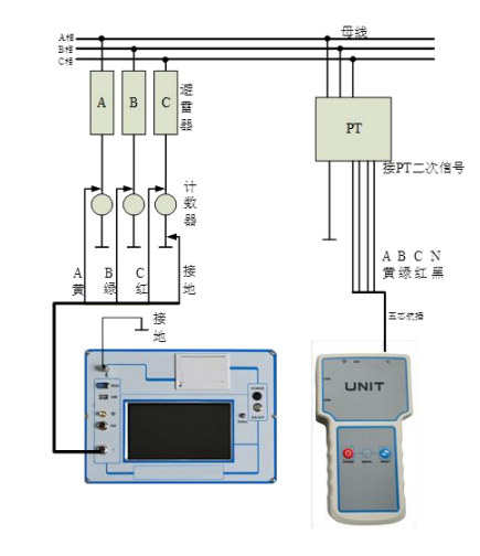 測(cè)試線接線方法如圖 3 所示,請(qǐng)先接主機(jī)電流線(航插 4 芯引出 4 根線),接入主機(jī)航插,再接黑線到計(jì)數(shù)器下端地線,然后分別按黃綠紅顏色線接入 A、B 、C 相避雷器下端計(jì)數(shù)器上端。再接單元的電壓線(航插 5 芯引出 4 根線),接入單元航插,再接 PT 二次測(cè)量端,分別按黃綠紅黑顏色線接入二次側(cè)測(cè)量端的 A、B、C、O,一定要小心謹(jǐn)慎接線以避免 PT 二次或試驗(yàn)電壓短路。
