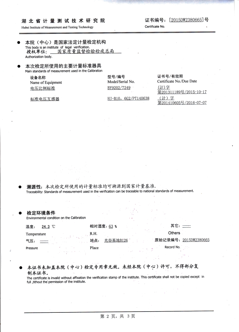| 試驗(yàn)電壓 | 一次繞組感壓耐壓為1.2 Un,1分鐘,二次繞組對地,工頻耐壓2KV,1分鐘 |