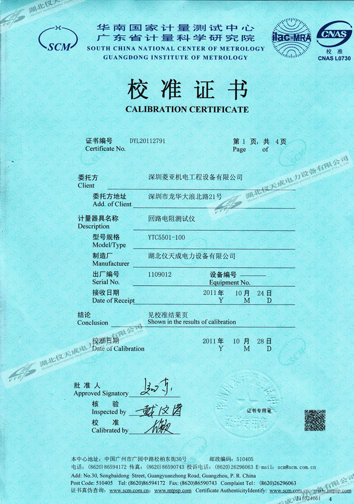 YTC5501-100A 回路電阻測(cè)試儀的資質(zhì)證書(shū)