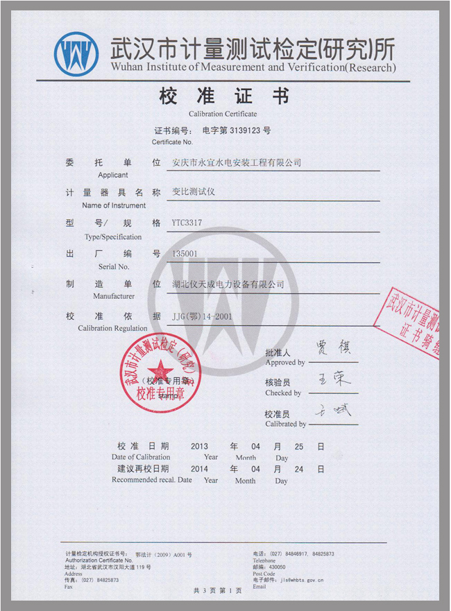 YTC3317全自動(dòng)變比組別測(cè)試儀鑒定證書