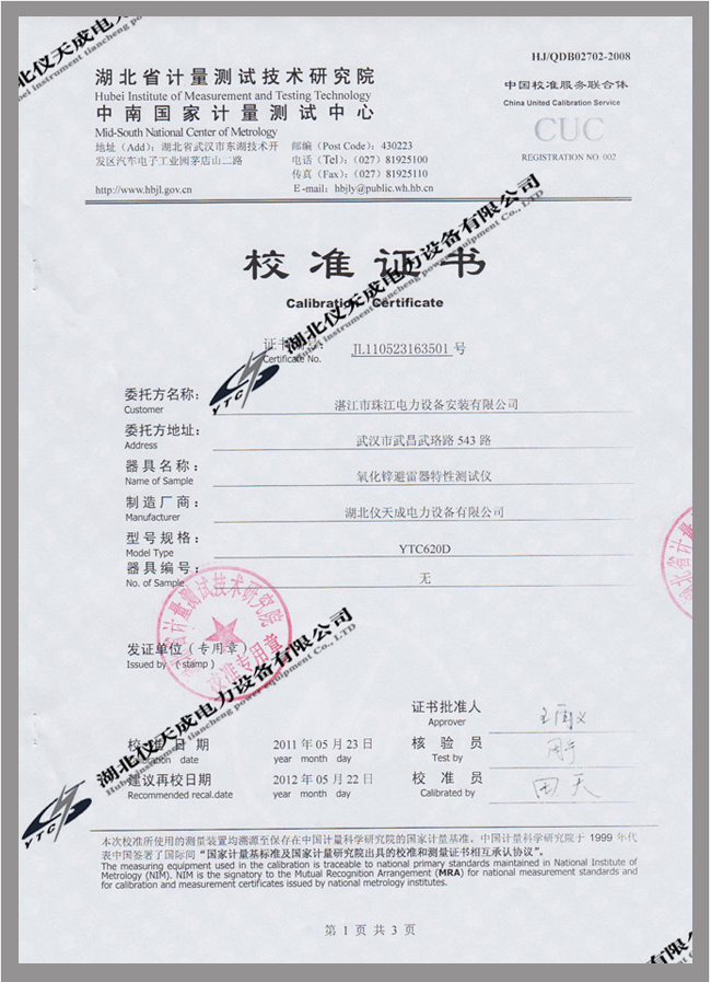 轉(zhuǎn)載:"氧化鋅避雷器特性測試儀鑒定證書" 請注明來源于儀天成電力。 更多技術(shù)問題請致電儀天成電力客戶服務(wù):027-87876585,技術(shù)部專線:027-87876585,在線客服:719388481